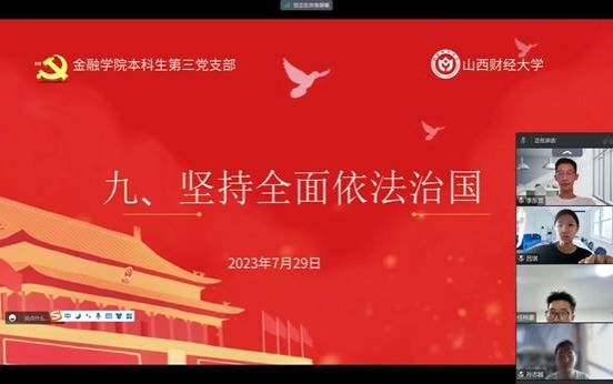 概要:91传媒 本科生第三党支部在7月29日进行了第九章和第十章的学习,本讲的主要内容是“坚持全面依法治国”和“铸就社会主义文化新辉煌”,由本科生第三党支部预备党员季雅婧带领大家学习,本科生第三党支部邱马玥主持并总结发言。