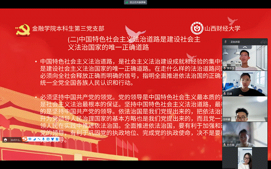 “全面依法治国,铸就社会主义文化新辉煌,是我们党在全面治国的总格局中,坚持要走的社会主义法治道路。” 会议伊始,本科生第三党支部预备党员季雅婧讲到。随后,她给支部成员们分享了主题为《坚持全面依法治国,铸就社会主义新辉煌》的学习心得——“全面依法治国是国家治理的一场深刻革命,必须坚持厉行法治,推进科学立法、严格执法、公正司法、全民守法。全面依法治国是中国特色社会主义的本质要求和重要保障。全面依法治国是指以宪法为根本的法治国家,以法律为基础,以法治思想为指导,以法治制度为保障,以法治文化为支撑,以法治精神为推动,以法治实践为实现的治理国家的总体思想和总体目标。”