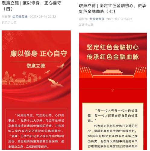 充分利用晋商文化资源,从历史遗存、文化经典、文化古迹中挖掘克己奉公、清廉自守的廉洁思想、廉政故事,挖掘晋商精神、金融文化,结合学科特点,提炼廉洁内容,通过师生喜闻乐见的活动内容和形式,让廉洁文化以“更生动、更鲜活、更有效”的方式传播,不断将传承红色基因、培育廉洁意识贯穿到大学生思想政治教育全过程。特别以“互联网”为平台,在学院公众号“金院融益通”开设“敬廉立德”专栏,截止目前累计专题17期,阅读量达2000多,营造了良好的清廉育人环境。