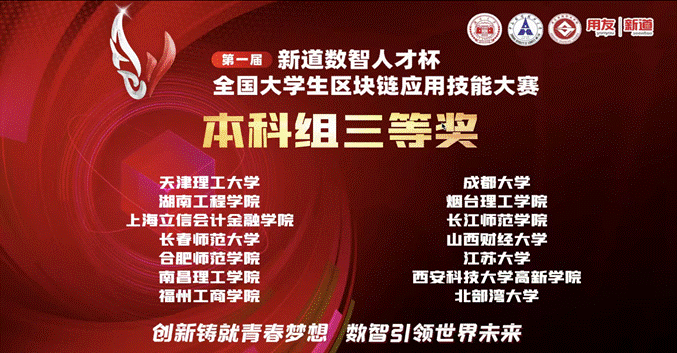第一届“新道数智人才杯”全国大学生区块链应用技能大赛全国总决赛由全国高校人工智能与大数据创新联盟指导,湖南大学、中南财经政法大学、浙江金融职业学院承办,新道科技股份有限公司提供全程技术支持。大赛旨在推进区块链数字产业实践育人工作的开展,深度对接互联网+创新创业产业赛道命题,提高区块链人才的培养质量。比赛通过“理论+实践+方案”三位一体的考核方式,促进培养学生的区块链意识及创新思维,帮助学生借助区块链技术探索解决实体产业变革问题,加快促进区块链基础知识在高校的普及和创新能力提升,使学生能够运用所学区块链知识,正确认知区块链技术及区块链应用场景,真正理解区块链的核心价值,并能够结合区块链技术特征解决行业应用问题,塑造学生基于区块链技术的创新意识、创造精神及创新能力。