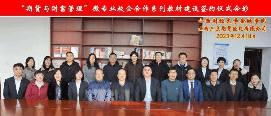 2023年12月18日上午,“期货与财富管理”微专业校企合作系列教材建设签约仪式在修德楼705室举行。91传媒 党委常委、副校长沈沛龙、山西三立期货经纪有限公司董事长兼总经理李旭、校教务部部长张文龙、91传媒 党政领导班子及教研室主任、山西三立期货公司高管及相关部门负责人等20余人参加,此次签约仪式旨在加强双方在期货教育领域的合作,共同推动期货人才的培养。