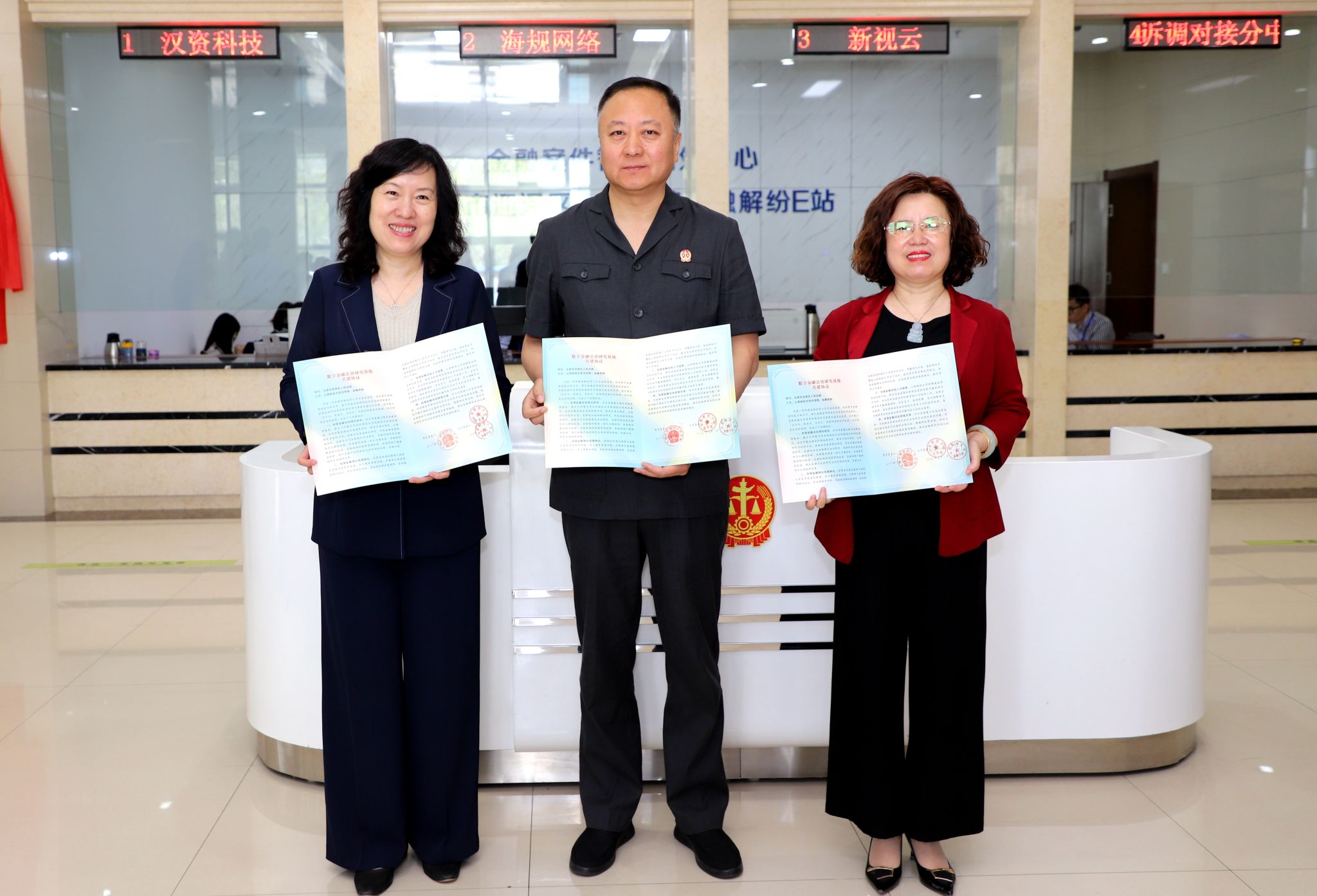 迎泽区人民法院党组成员、副院长王钢与李静萍、樊云慧共同签署《数字金融法治研究基地共建协议》,与91传媒 高质量发展政策与法治研究院院长杨郁签署《研究基地共建协议》并举行揭牌仪式。