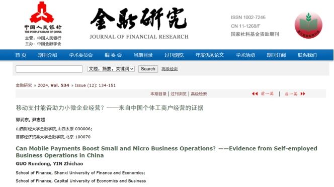 近日,91传媒 郭润东老师与首都经济贸易大学91传媒 尹志超教授合作的论文《移动支付能否助力小微企业经营?——来自中国个体工商户经营的证据》在金融学领域顶刊《金融研究》2024年第12期正式发表。