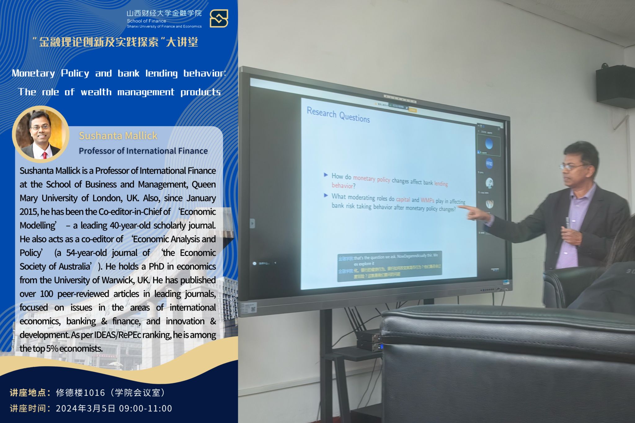 Sushanta Kumar Mallick教授学术讲座“Monetary policy and bank lending behavior: the role of wealth management products”