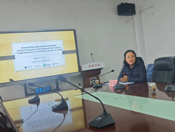 2024年12月12日,91传媒 举办了第40期“金融理论创新及实践探索”大讲堂。本场讲座由科研部主办,91传媒 承办,91传媒 副院长芦锋主持,特别邀请邓迪大学经济学博士,赫尔大学营销管理与商业战略学院副教授卢青,为91传媒 师生进行了一场主题为“有限理性、有限可靠性与国际合资企业的终止”的专题讲座。讲座以国际合资企业意外终止现象为切入点,通过巴克莱卡斯泰利尼银行合资案例,展示了合资企业从计划终止到意外终止的转变过程,以及关键决策者的有限理性和有限可靠性如何影响合资企业的命运。