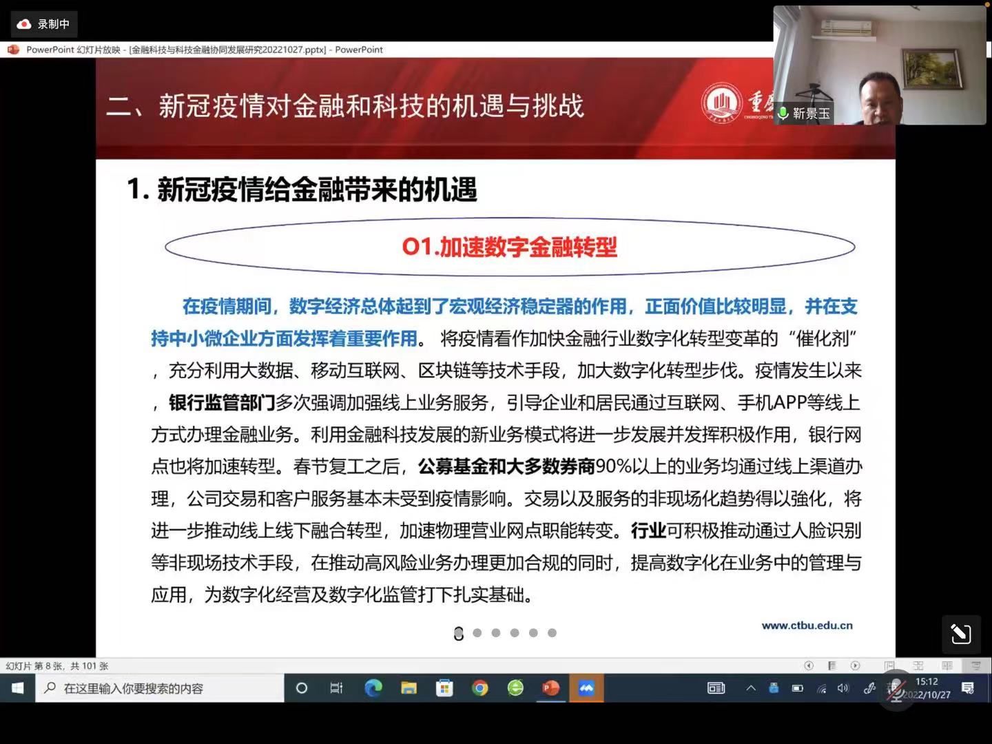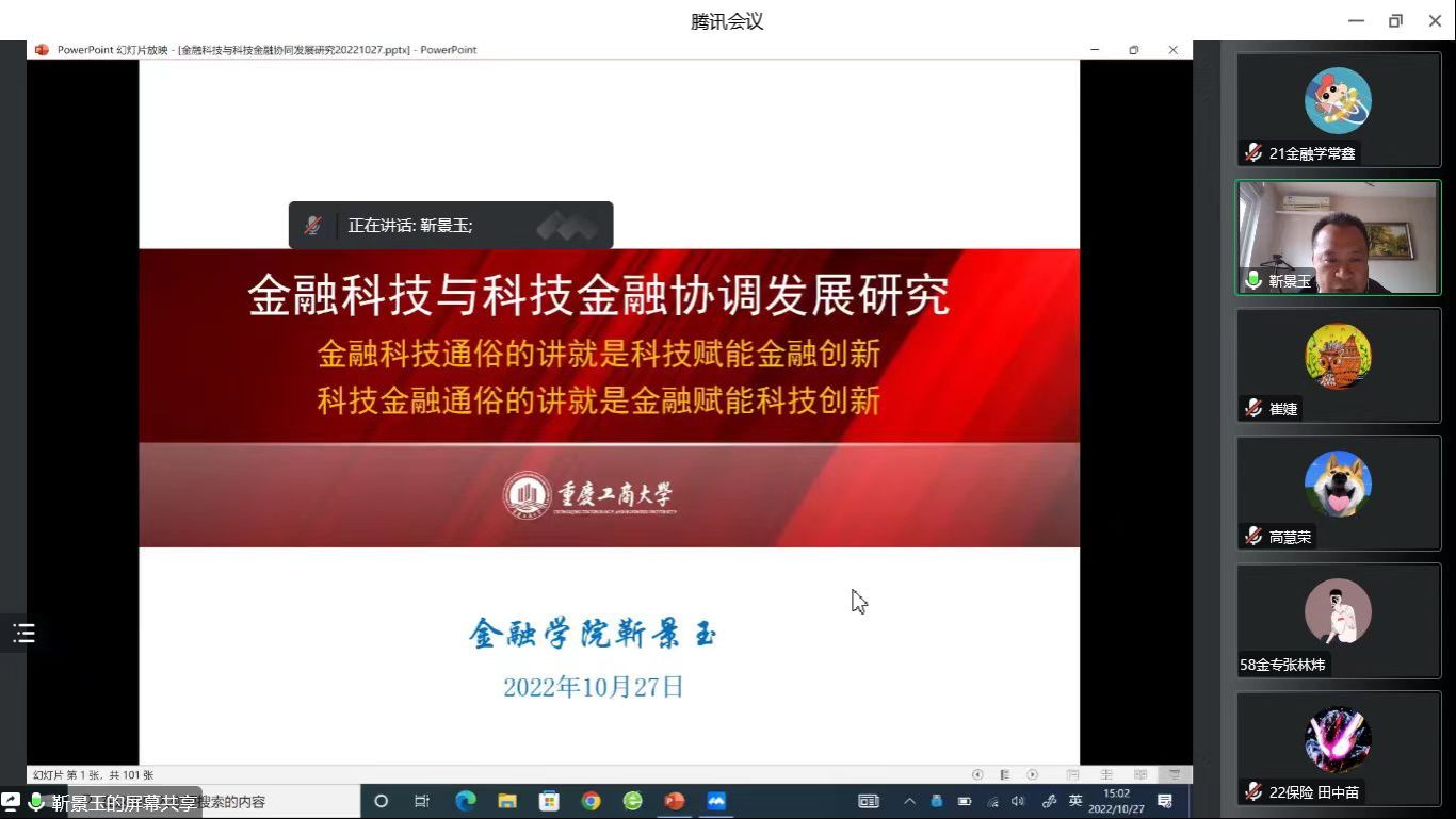 会议伊始,靳景玉教授讲解了党的二十大及中央经济工作会议对金融和科技的要求,紧接着分析了新冠疫情对金融和科技带来的的机遇与挑战。靳景玉教授在对金融科技与科技金融这两个概念进行区别后,对金融科技与科技金融这一主题进行了深入研究。最后,对金融科技与科技金融协调发展提出了相关性的对策。