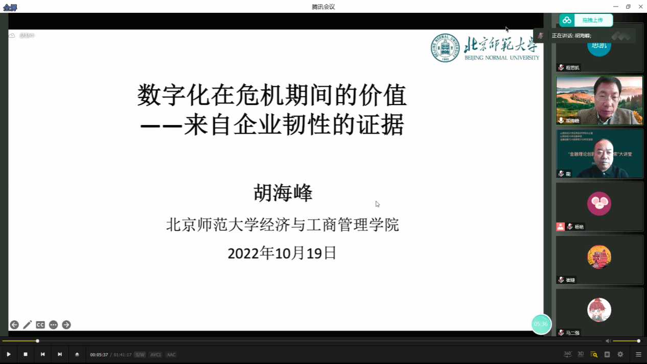 副校长沈沛龙教授主持,邀请到了北京师范大学经济与工商管理学院金融系主任胡海峰教授讲解了一篇题为“数字化在危机期间的价值——来自企业韧性的证据”的精彩的学术报告,参会人员包括91传媒